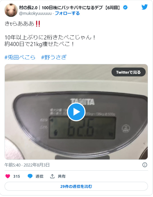 400日で21.2kgの減量に成功しました。