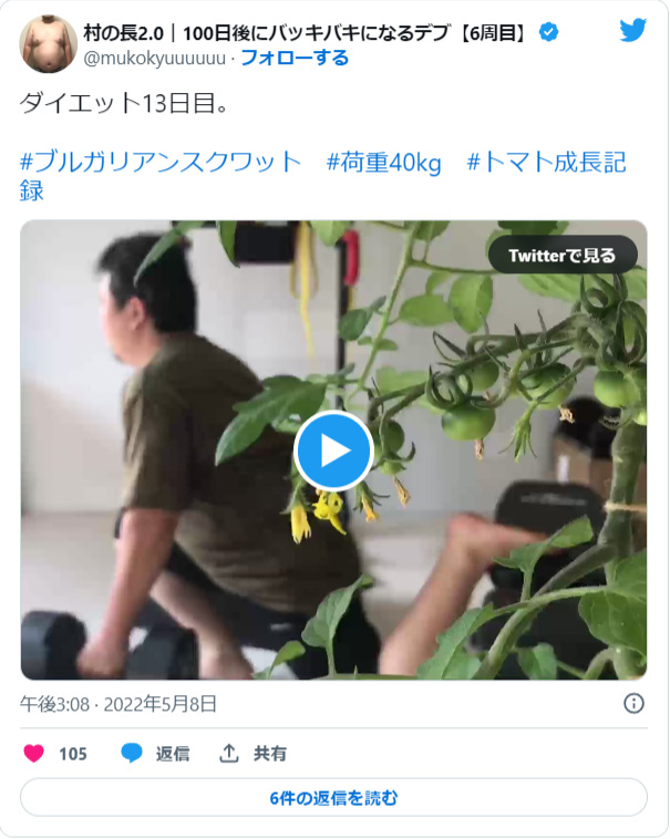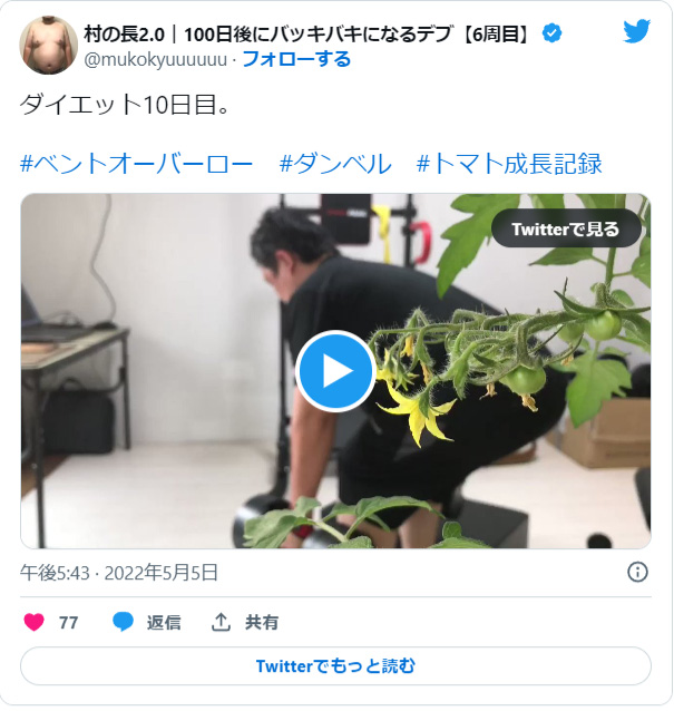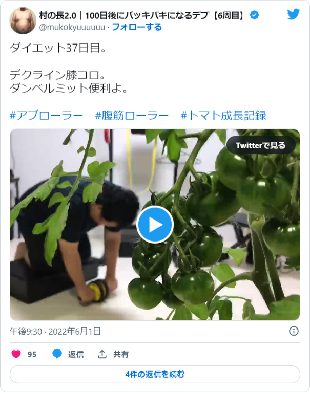 プランターに植えたトマトに実が付いたので筋トレとトマトの成長記録を同時に行う画期的な発明をする。