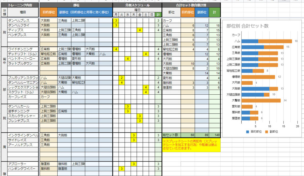 種目に対する対象部位を自動計算するスプレッドシートを作成。