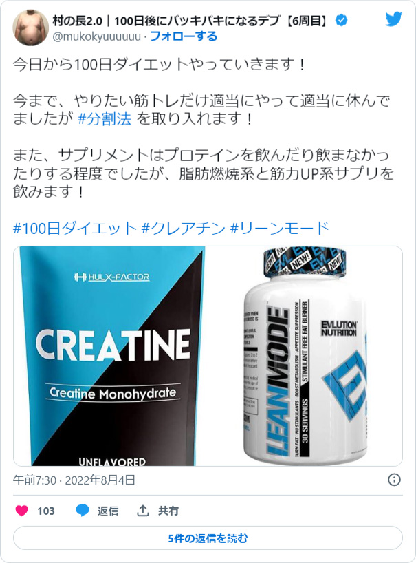 筋肥大系のサプリメント「クレアチン」を摂取し筋トレのボリュームを向上させ、筋肥大を試みます。