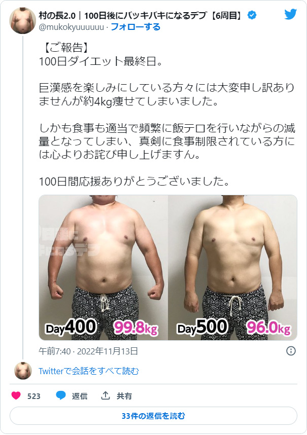 シーズン1は121kgから112kgで「-9kg」の減量。