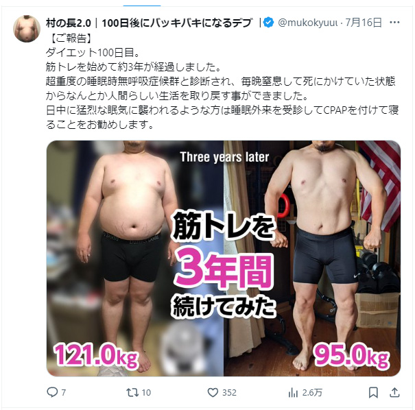 睡眠時無呼吸症候群の時はどんなに寝ても1~2時間程度の睡眠しかとれないため日中はほぼ寝ているような生活でしたので筋肉はみるみると落ちていき脂肪が増え続けるという悪循環でした。