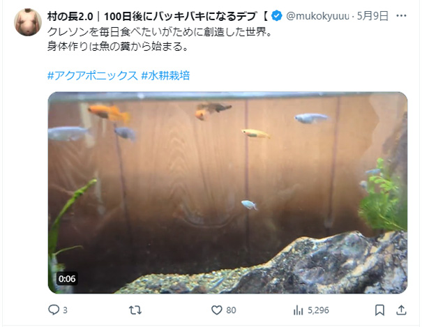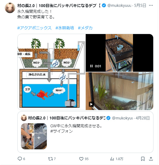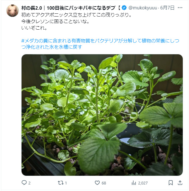 それでも「筋肉の為にクレソンを食べたい!」そんな思いからアクアポニックスという室内で魚の糞から野菜を育てるシステムを採用しました。