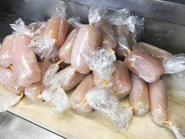 ハム状に成形することによって見た目が良くなるばかりか、複数の鶏胸肉の形を均一にすることによって熱の入り方を均等にします。