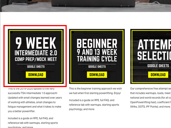 「TSA中級2.0」プログラムは、アメリカのパワーリフティングコーチンググループのThe Strength Athlete(TSA)が無料で公開しているパワーリフティングのトレーニングプログラムの中の「9 WEEK INTERMEDIATE2.0 COMP PREP/MOCK MEET」となります。