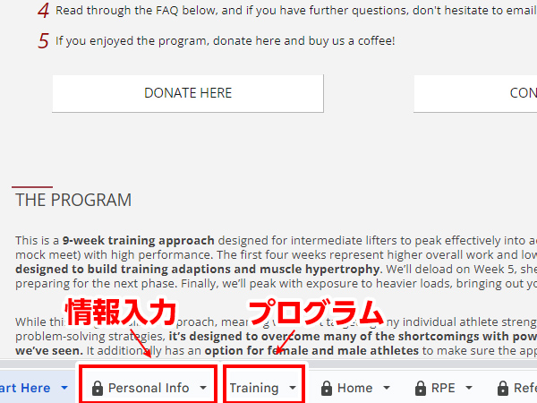 「Start Here」「Personal Info」「Training」「Home」「RPE」「Reference」と6つのタブに分かれていますが、使うのは「Personal Info(情報入力)」と「Training(実施プログラム)」の2つだけで十分です。