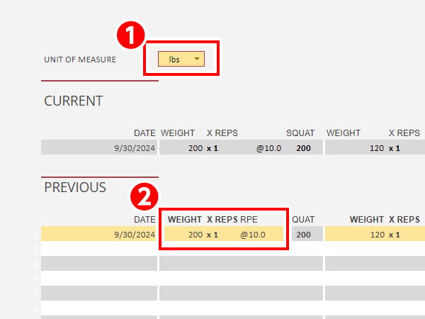 まずは「UNIT OF MEASURE(測定単位)」が「lbs」になっているので「kgs」にして、「PREVIOUS」にMAX重量を入力します。